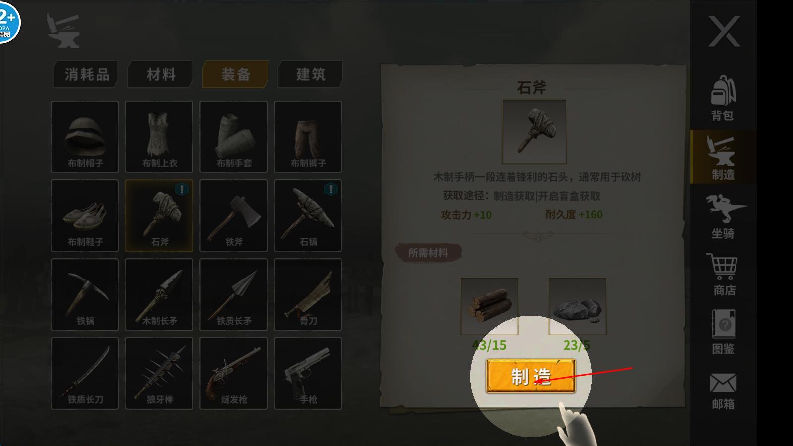 2、制作武器和搭建基地,驯服地图内的野兽。