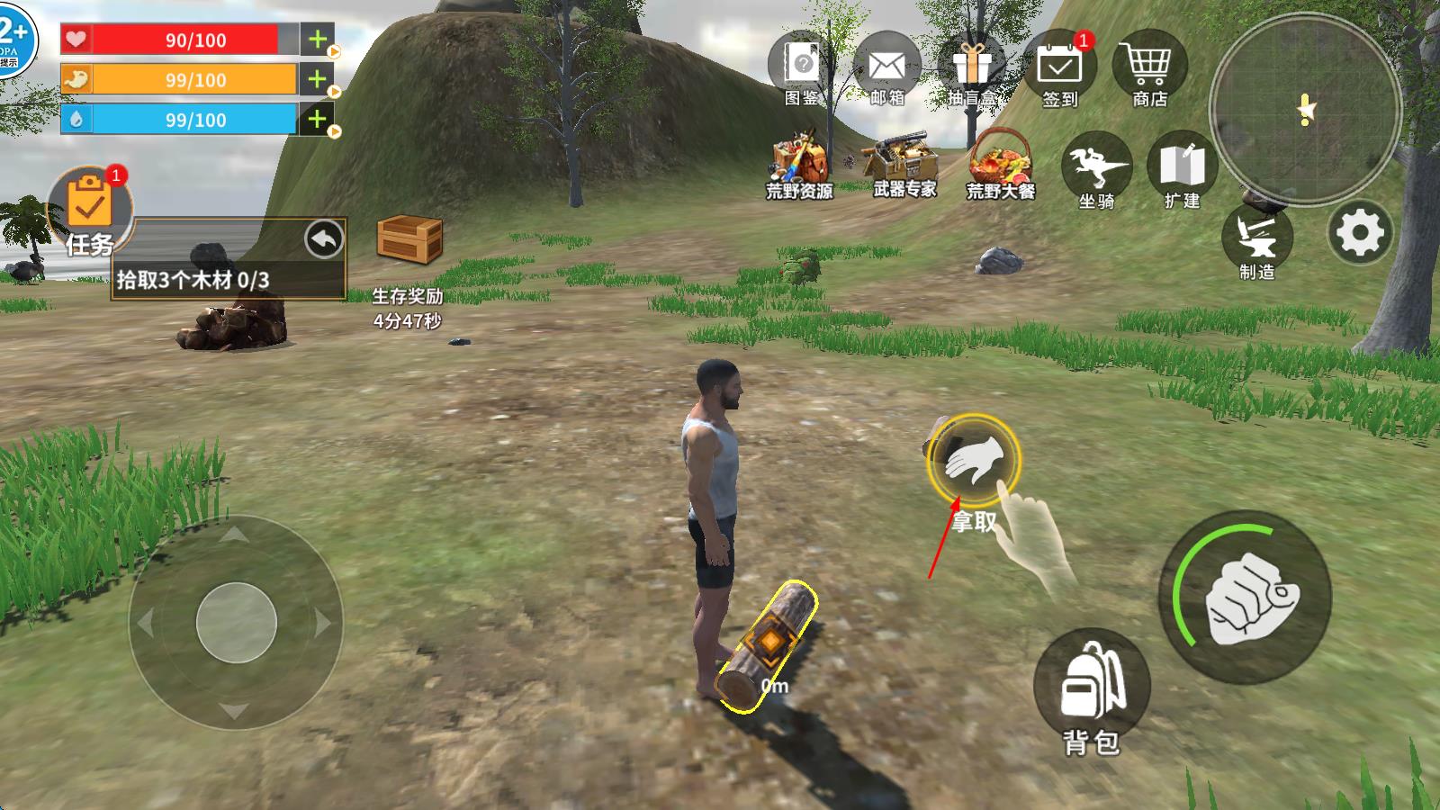 1、收集远古地图内的各种生存资源维持生存。