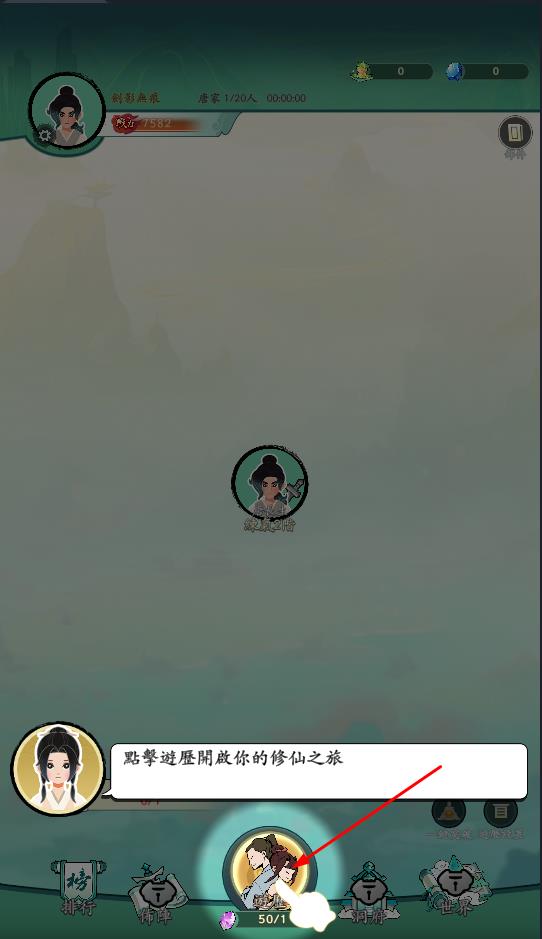 1、在修仙游戏中,点击游历按钮开启修仙之旅,这是探索游戏世界、触发剧情的基础操作,展示角色功能按钮。
