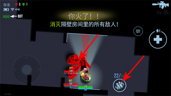 3、消灭敌人后会触发“你火了”状态,需消灭隔壁房间里的所有敌人,可使用右侧技能按钮辅助战斗。