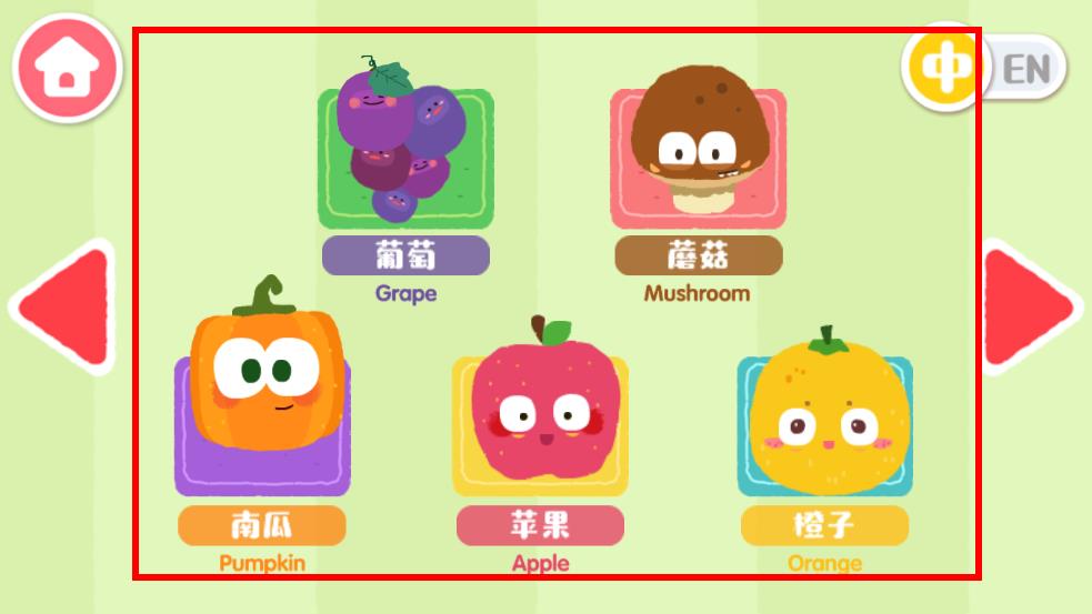 1、进入宝宝爱水果蔬菜游戏界面,会看到多种带有可爱表情的水果蔬菜图标,不同水果不同的样子流程,可通过左右箭头选择开始游戏。