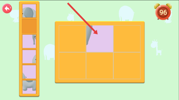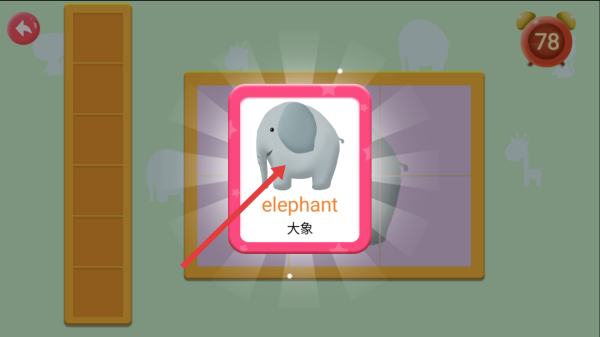 2、遇到动物图案,注意留意轮廓特征,精准放置图块,完成拼图后弹出来动物名称如elephant大象。