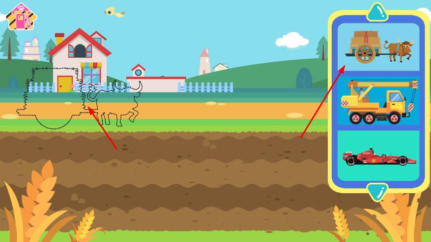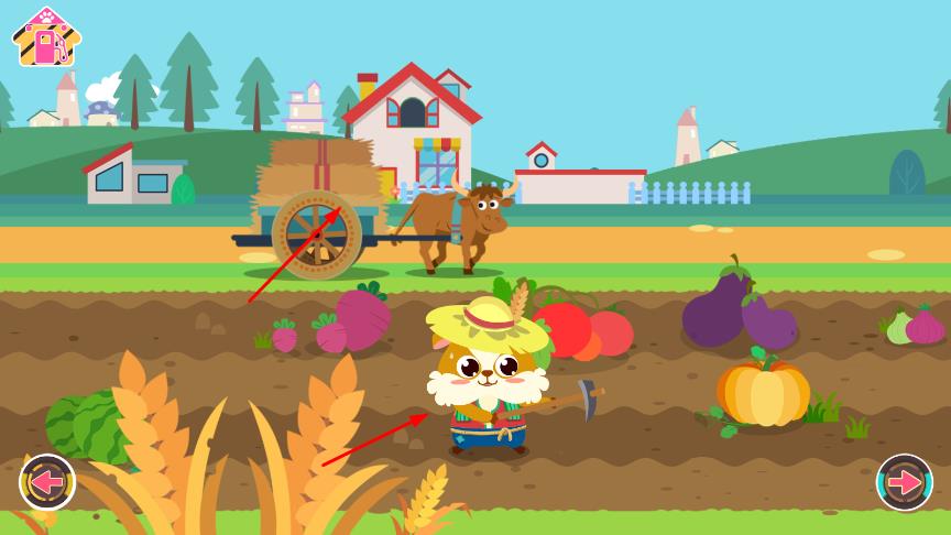 3、对应的职业场景,如农田里的牛拉车与农民劳作,出现各种农作物,认识各种农作物,进一步丰富孩子对农田和农业相关知识的认知。