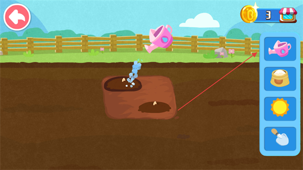 4、选择水壶工具浇灌种植区域,完成作物的灌溉步骤,推进农场种植进程。
