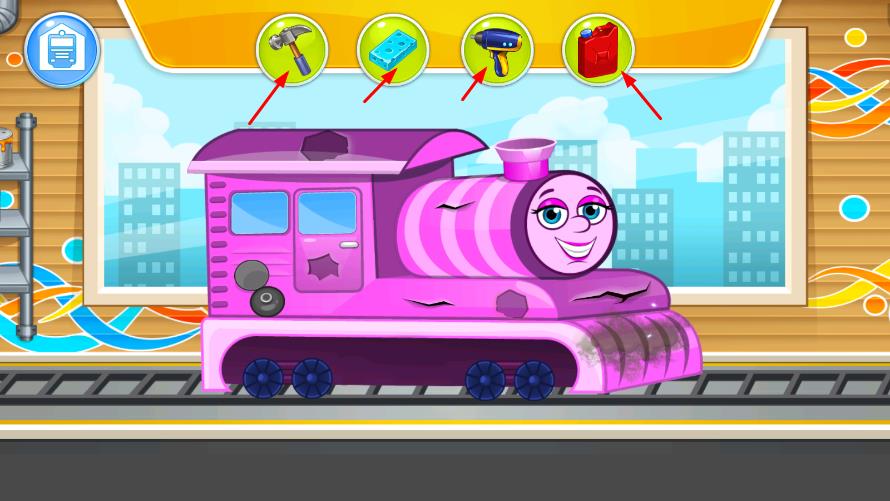 1、选择车型与初始检查:从车库中挑选待修火车,通过观察外观与提示,初步判断可能存在的故障,如冒烟的烟囱、破损的车窗,为后续修理确定方向。