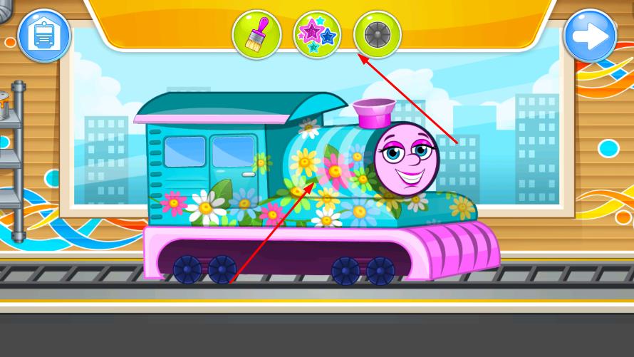 3、外观和内部修复好后,进入装饰环节,使用画笔、贴纸等工具,为火车装饰完成,展示修理好的火车。