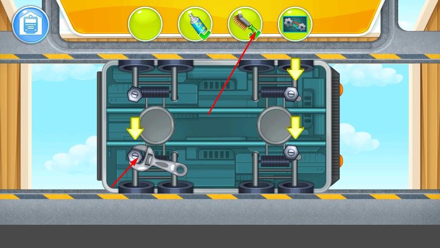 2、分步操作完成修理:根据故障类型,使用对应的工具,用螺丝刀拆卸螺丝,、用颜料修补车身划痕,按步骤完成零件更换与修复,过程中可自由尝试不同操作顺序。