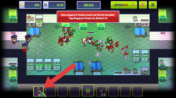 3、上方提示使用如手榴弹等支援物品!点击支援物品以选择,呈现出像素风格的病毒感染对战场景,有僵尸、人类角色及相关道具界面。