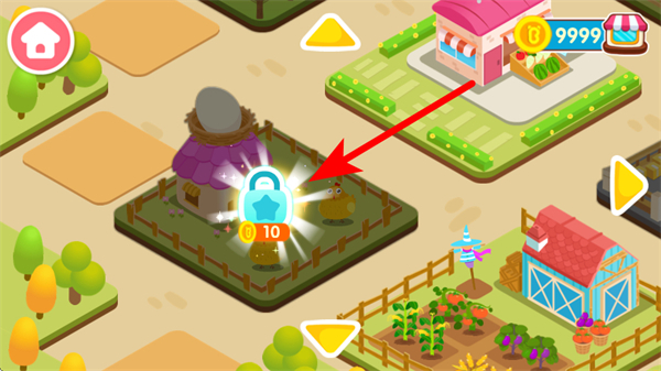 2、在农场地图中,点击带锁的区域消耗对应货币,示例中10金币,解锁新的农场区域以拓展经营空间。