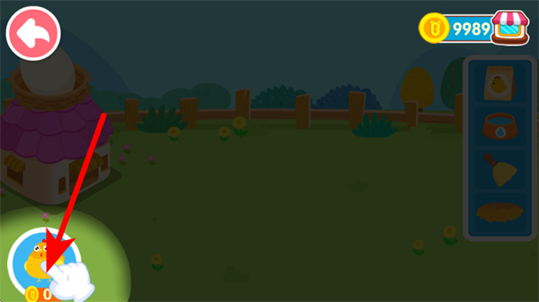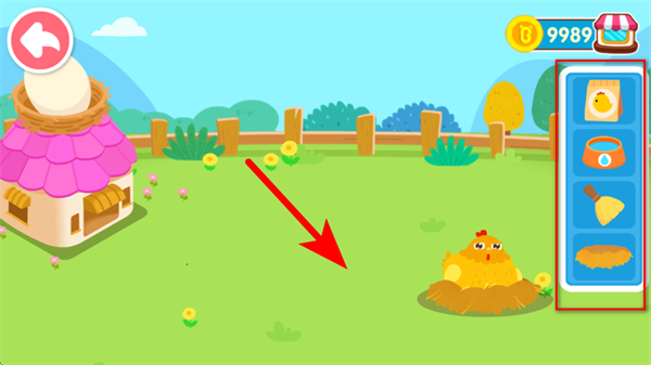 3、在解锁的区域内,点击右侧道具栏中的小鸡道具,将其放置到农场场景中,完成养殖类道具的布置。