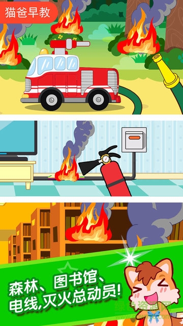 儿童消防小分队是猫爸早教推出的一款儿童休闲益智游戏,模拟消防员来普及森林、图书馆等场景下的灭火操作,让孩子正确了解火灾,学习防灾知识,欢迎大家下载体验!