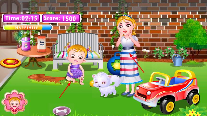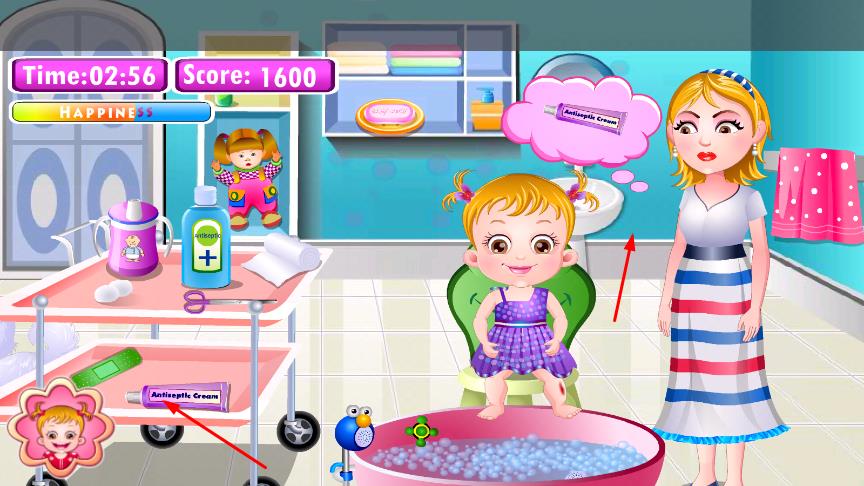 2、根据提示,和宝贝玩耍,宝贝突然受伤,需要进行护理,点击相应的物品,进入护理准备阶段。