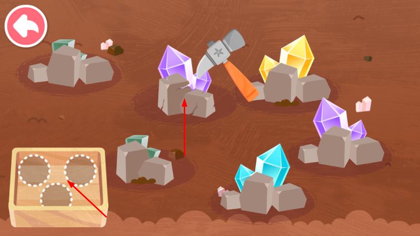 1、进入界面,点击进入挖矿场景,在挖矿场景中,使用锤子敲击地面上的矿石堆,挖掘出各种颜色的水晶宝石。