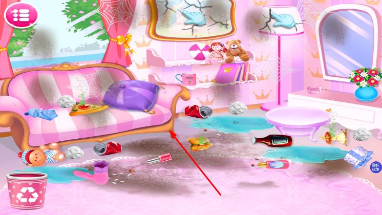 2、在脏乱房间中,点击垃圾、污渍等需要清洁的物品,进行初步清理,对于难以清洁的地方,选择对应的专业清洁工具,进行清洁。