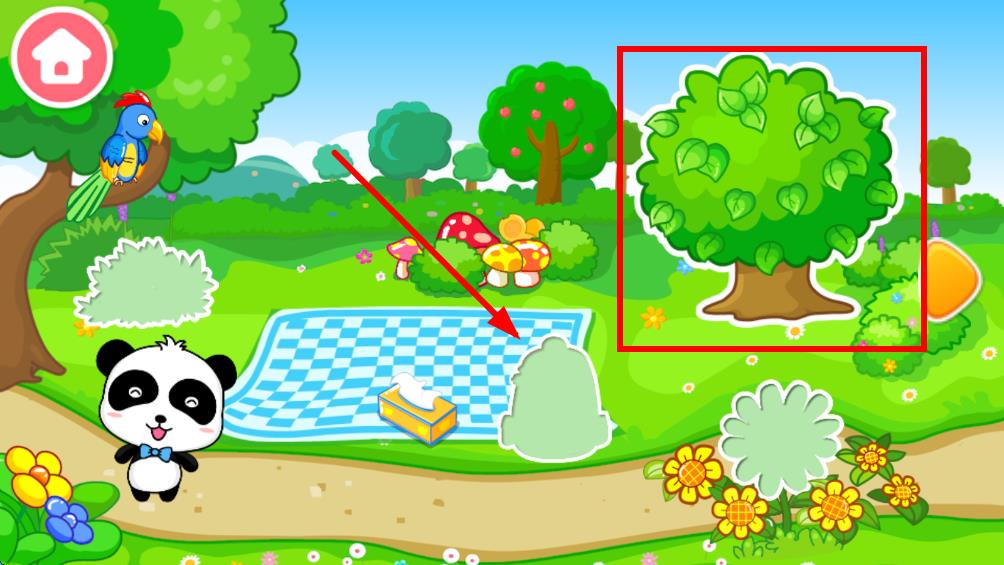 1、进入宝宝数字岛游戏画面点击画面中箭头所指位置,开始为场景添加树木元素。