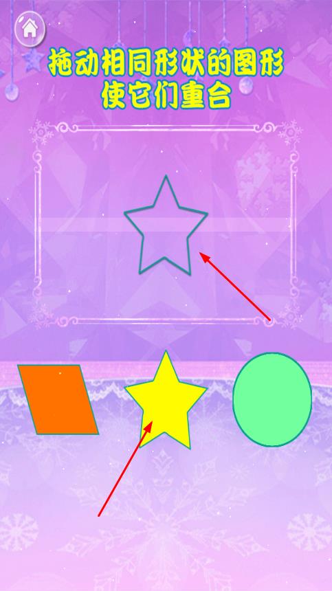2、以形状识别模块为例,根据提示拖动相同形状的图形使它们重合,找到下方与上方轮廓形状相同的图形,用手指拖动,将其移动到轮廓位置,完成形状匹配学习。