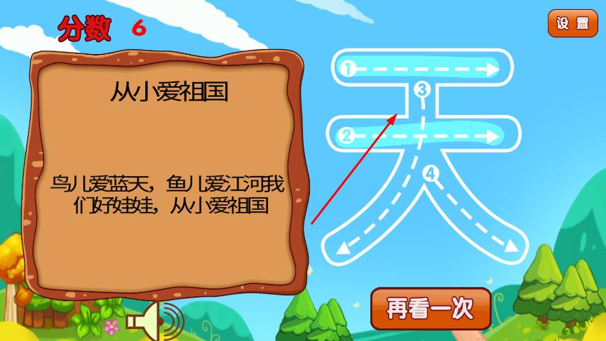 3、右侧是汉字的笔画书写顺序指引,可以按照右侧的笔画顺序指引,在屏幕上跟随书写汉字,同时结合左侧的儿歌内容,加深对汉字的认识和记忆。
