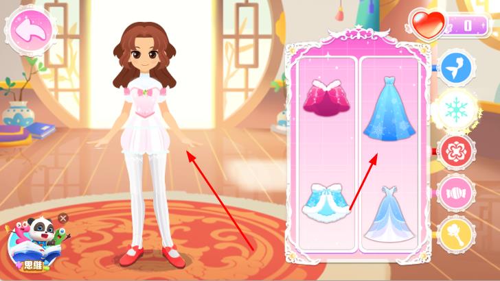 2、通过点击右侧的其他图标,选择配饰、发型等进行搭配,完成换装后,公主可以进入展示场景,展示精心打扮后的形象。