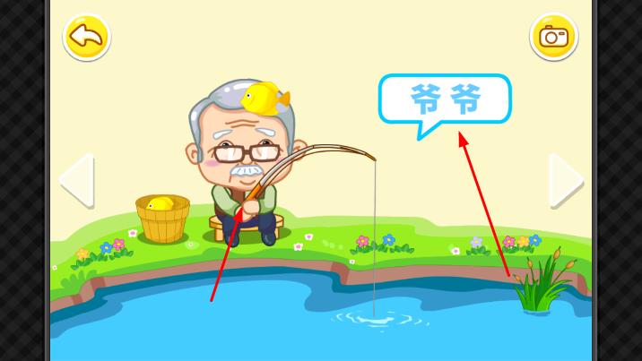 2、点击头像后,进入对应家庭成员的互动场景,场景中会显示该成员的名称,通过互动元素触发动画,帮助认识该家庭成员。