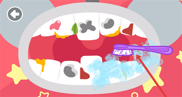3、进入治疗环节后,先用紫色牙刷清理小动物牙齿上的食物残渣和污渍。