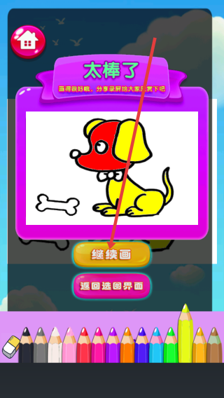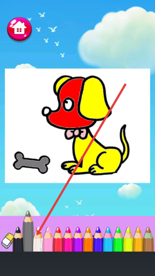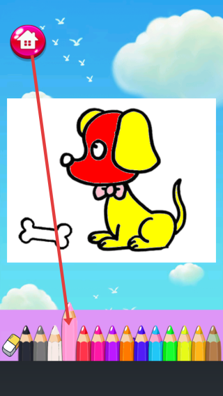 1、儿童涂色填色进入游戏时,选择自己喜欢的图案如小狗,从下方选彩色铅笔,点击图案区域涂色。