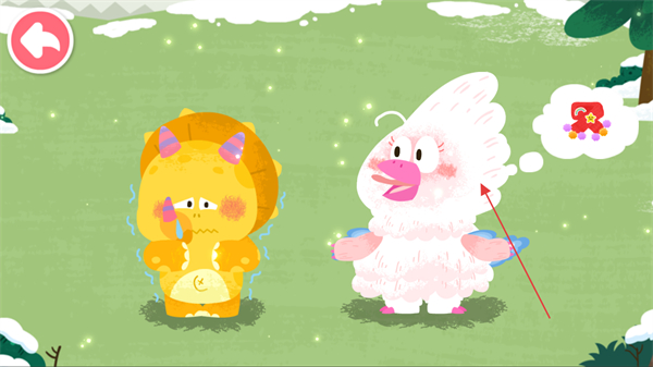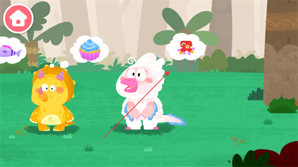 1、查看恐龙角色的需求气泡如蛋糕、饰品,了解互动目标。