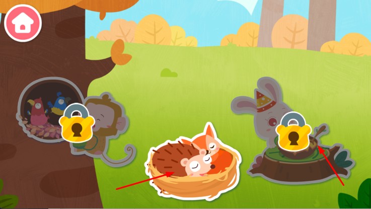 1、进入界面,点击按钮开启森林冒险,在初始场景探索,遇到带锁动物图标。