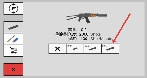 4、在消音器选择界面,选择合适的消音器如x0.5倍率的消音器,点击为武器装备消音器。
