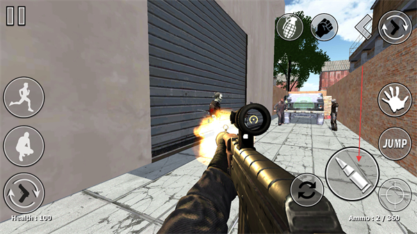 3、左侧有跑步、下蹲等虚拟按键,可控制角色移动状态,利用这些操作调整站位,躲避僵尸攻击或寻找射击优势位置。