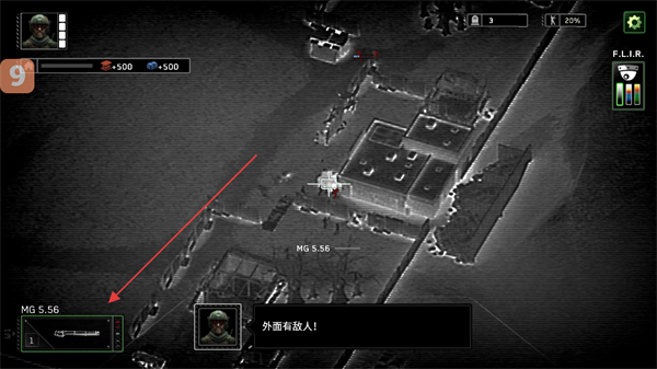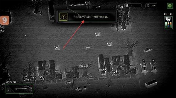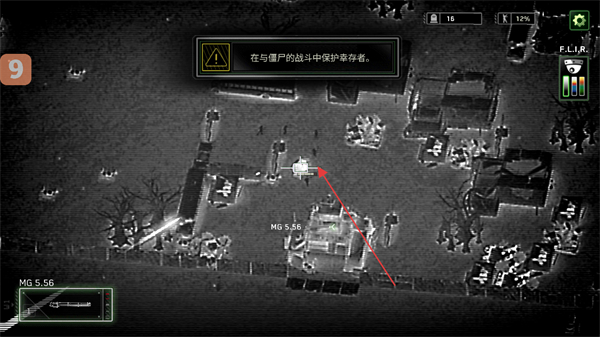 1、根据提示,操控炮艇武器如MG5.56攻击僵尸,保护幸存者,推进关卡目标。