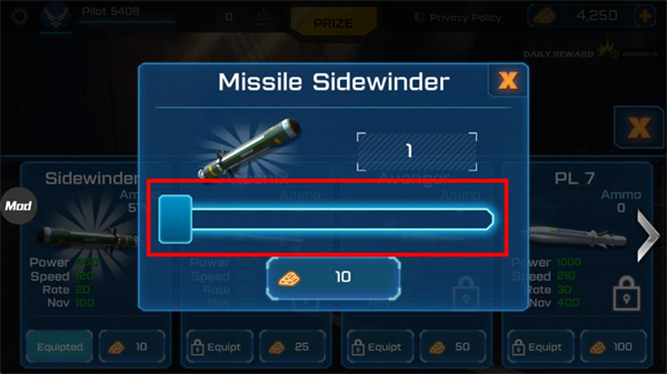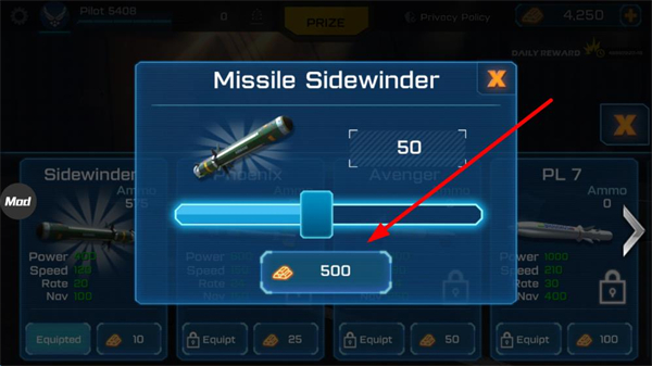3、在导弹购买详情界面,通过滑动进度条选择购买数量,确认后消耗相应的货币。