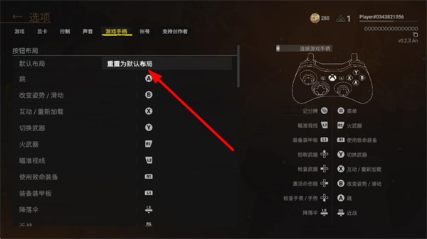 3、在游戏手柄页面中,找到重置为默认布局选项并点击,触发重置确认弹窗。