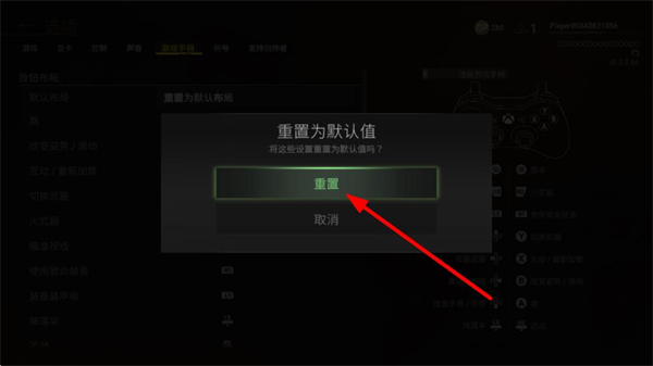4、在弹出的重置为默认值确认弹窗中,点击重置按钮,即可将手柄按键恢复为默认布局。