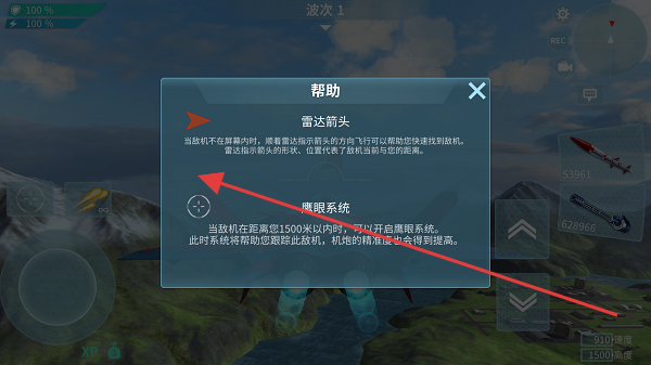 3、点击帮助按钮查看游戏指引,如跟随雷达箭头找敌机及在敌机近时用鹰眼系统提升精准度。