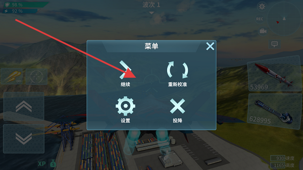 2、点击暂停按钮唤出菜单界面,可点击继续可回到战斗,也可进行重新校准、设置等操作。