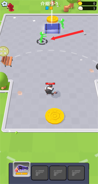 4、传送后遇到绿色丧尸目标,操控角色靠近并使用武器发起攻击,击败丧尸可完成关卡目标,积累游戏资源。