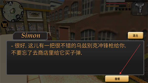 3、与NPC对话后,可从NPC处获得武器,如乌兹别克冲锋枪,同时会收到后续操作提示,点击继续的按钮。