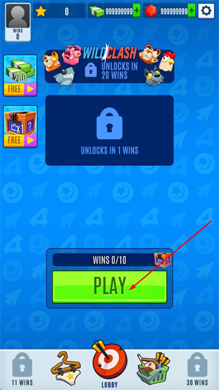 1、进入软件主界面,点击绿色PLAY按钮开始游戏,界面显示需累计10胜,可解锁奖励且有免费道具可领取。