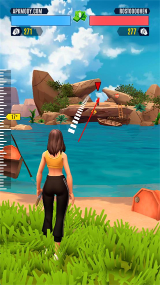 2、游戏中调整左侧角度刻度至合适位置,瞄准远处对手,按指示发射武器,界面显示双方生命值均为271。