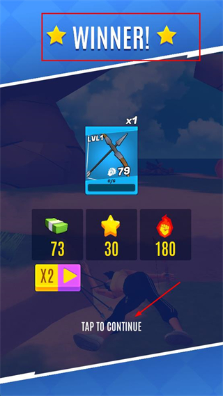 4、获胜后界面显示WINNER,获得73金钱30星星180火焰奖励,点击底部TAP TO CONTINUE继续游戏。