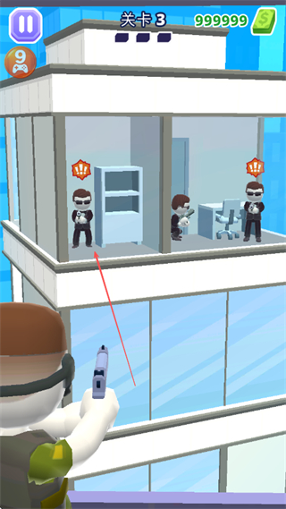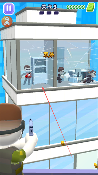 1、在关卡3中,观察建筑内敌人的分布,瞄准多个敌人的连线路径,实现双杀甚至多杀,高效消灭敌人。