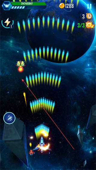 2、战机持续发射弹幕攻击敌方,击败后获取金币,消耗资源点击加强进一步提升战力。