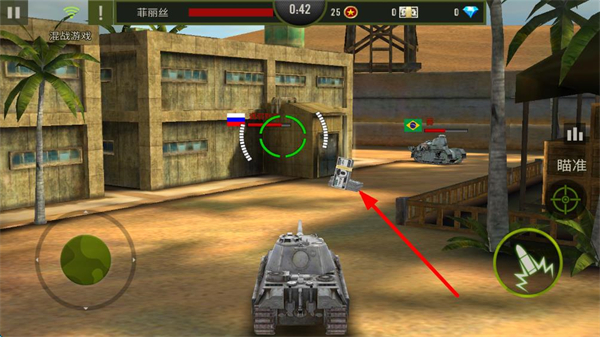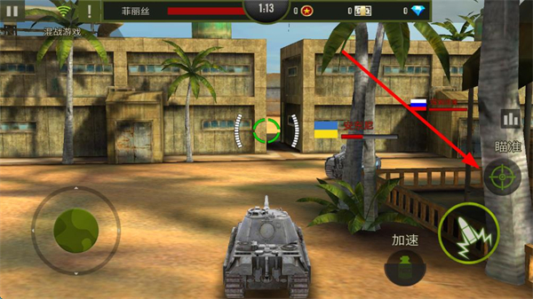 2、在地图发现敌人后,点击右侧的瞄准按钮,使用移动按钮操作,控制方向来锁定目标。