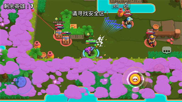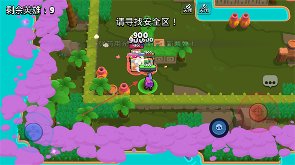 1、根据提示寻找安全区,躲避紫色毒雾,同时收集资源、攻击敌人。