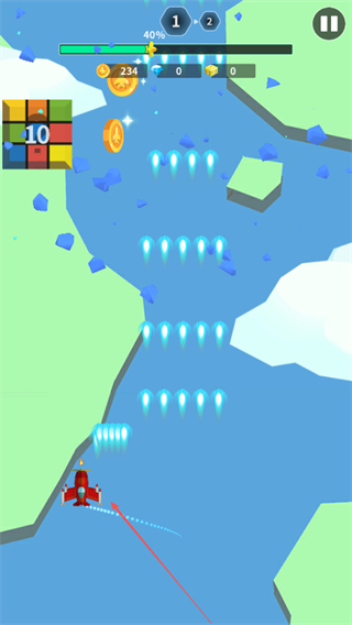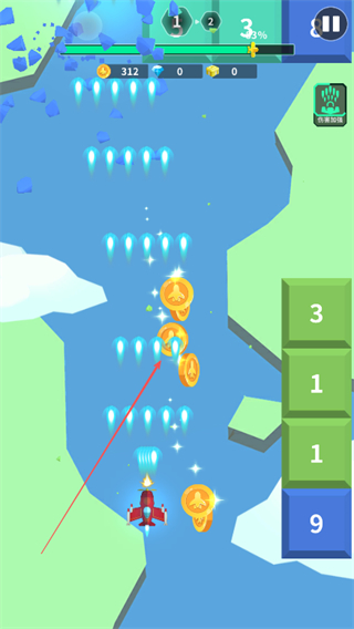 1、操控飞机在关卡中飞行,撞击数字方块以消除它们,同时收集金币。
