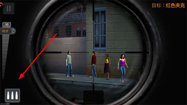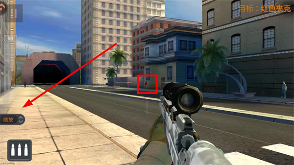 2、拖曳屏幕调整狙击枪瞄准方向,寻找目标所在位置,瞄准过程中需保持耐心,区分目标与平民,避免误杀。
