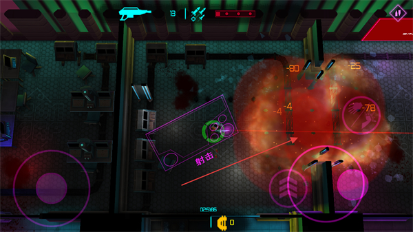 2、点击射击按钮攻击敌人,利用武器造成范围伤害,消灭沿途敌人。