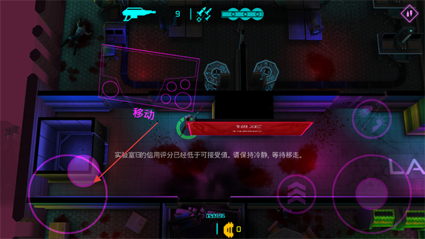 1、通过左侧移动按钮操控角色移动,注意实验室信用评分提示,保持冷静等待移走。