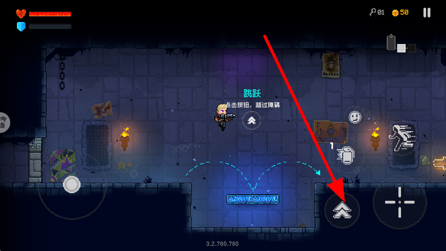 4、当遇到障碍时,屏幕右侧有跳跃按钮,点击该按钮,角色可进行跳跃,越过障碍,继续向目标前进,开展更多冒险。