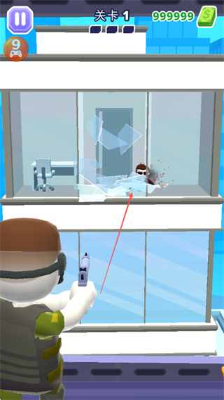2、瞄准建筑内的敌人如戴墨镜的黑衣人,发射子弹击碎玻璃,击中敌人将其消灭。